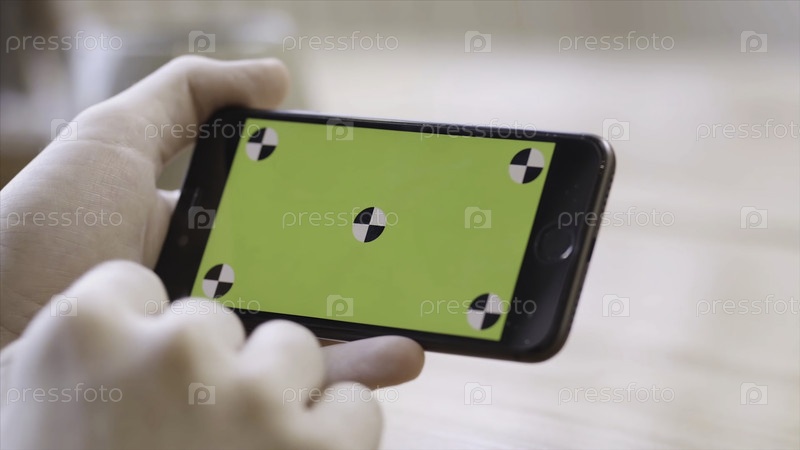 Руки женщины держат iPhone горизонтально, а ее пальцы скользят по зеленому экрану.Новая интернет-концепция, макет и технология