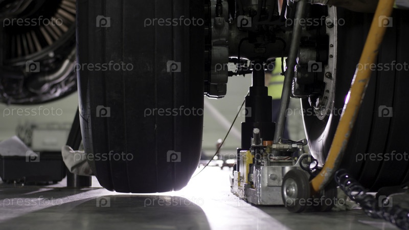Ремонт тормозов самолета. Закройте колесо и вал самолёта. Огромная резина с валом и посадкой под самолетом. Инженер исправляет 4K колесо