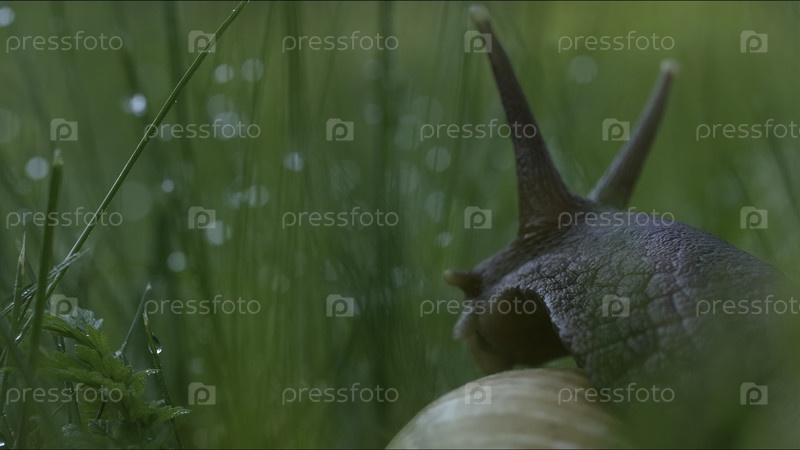Большая улитка в траве с росой. креативное. крупный план красивой улитки на фоне зеленой травы. виноградная улитка ползает по траве после дождя