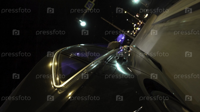 Быстрая черная машина едет по ночной дороге через город, вид с руля.Современный автомобиль движется по оживленному городу вечером, концепция автомобильного путешествия