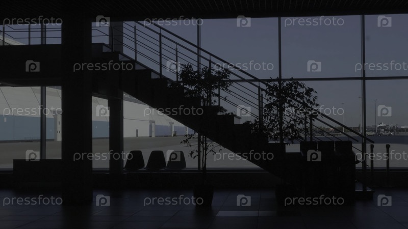 Небо закатывается за окнами бизнес-центра. HDR. Люди ходят в бизнес-центр или торговый центр с интерьером, украшенным растениями и лестницей