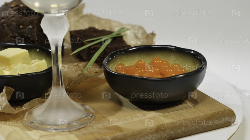 Масло, икра, черный хлеб. миска красной икры со ложкой подается с нарезанным хлебом, маслом и травами на белом фоне. цельнозерновой хлеб, масло и красная иквария, белый фон