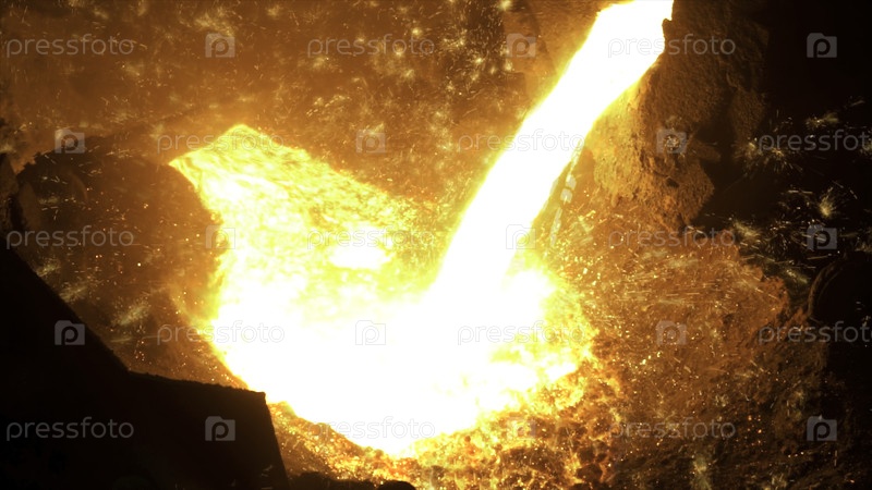 Искры на черном фоне от горячего процесса литья стали, тяжелой промышленности. резервные кадры. близко к жидкому металлу, протекающему из высокой печи