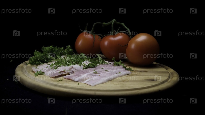 Закройте деревянную доску свежими ломтиками прошутто, спелыми помидорами и зеленью подчеркнутой на черном фоне. Рамка. Вкусная закуска, овощи, мясо и пряности