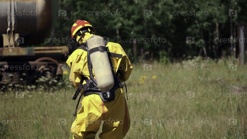 Люди, работающие в опасной зоне ходят на газовую маску посреди предупреждающего знака опасности