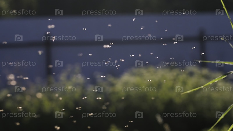 Маленькие комарики, окружающие цветы.Креативность.Макрофото белых цветов, вокруг которых летают маленькие насекомые, на которые светит солнечный свет