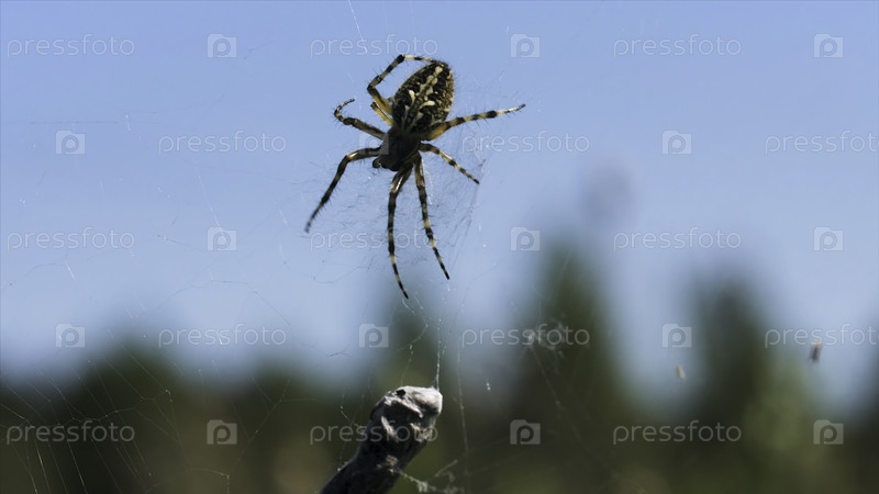 Закройте паука с добычей в природе.Креативный.Дикий паук онлайн на размытом фоне природы.Паук с добычей онлайн в солнечный летний день на лугу