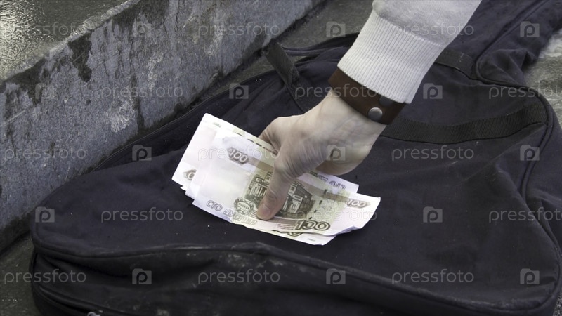 Закройте руки, получая советы из черного гитарного чехла на фоне серой тротуары.Русские бумажные деньги, взятые вручную из пустой чёрной гитарной сумки, концепция уличной музыки