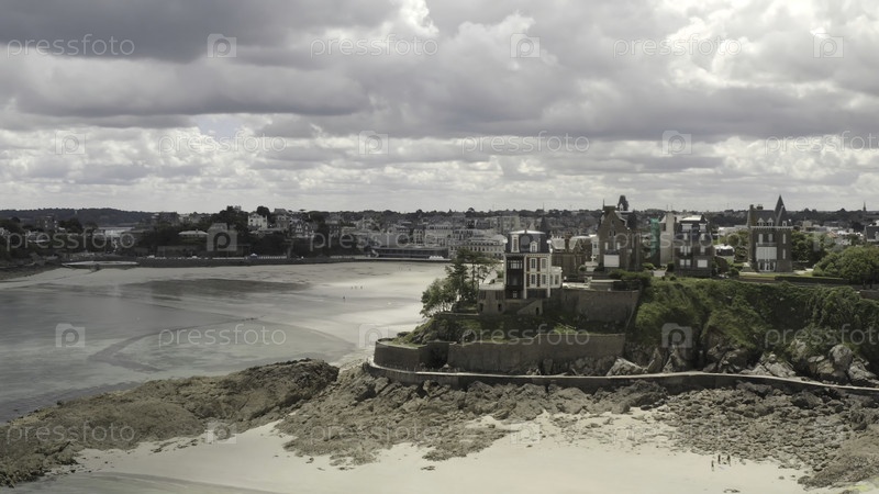 Прекрасный вид из воздуха на серый старый европейский город возле песчаного берега реки летом на фоне серого облачного неба