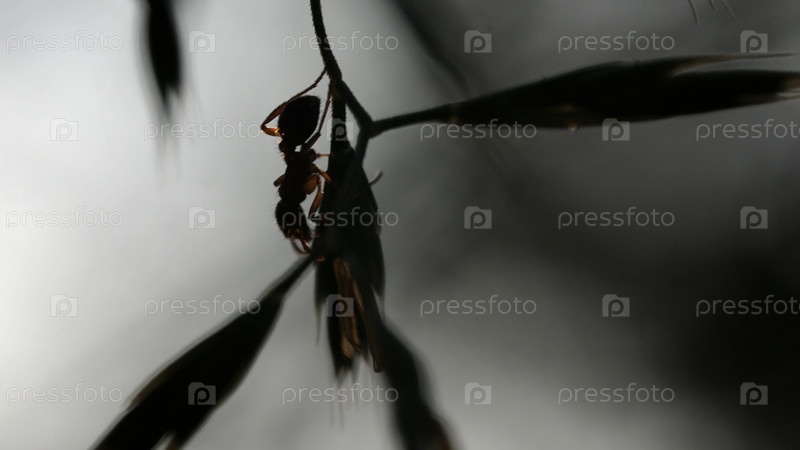 Закройте муравьёв на тонкой ветви на размытом фоне.Креативно.Маленькое насекомое на листьях дерева, макроскопия