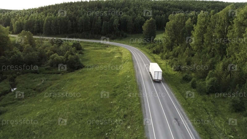 Красивый летний пейзаж с высоты птичьего полета. Сцена. Длинная дорога со спальными вагонами и огромный красивый зеленый лес с высокими деревьями, за которым село с маленькими домами и голубым чистым небом над головой