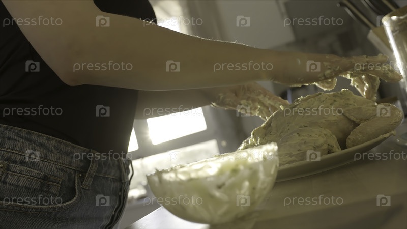 Закрытые женские руки готовят курицу к выпечке. резервные кадры. Женские руки надевают белую майонезную повязку и зелень на сырую курицу в домашней кухне, концепция приготовления пищи