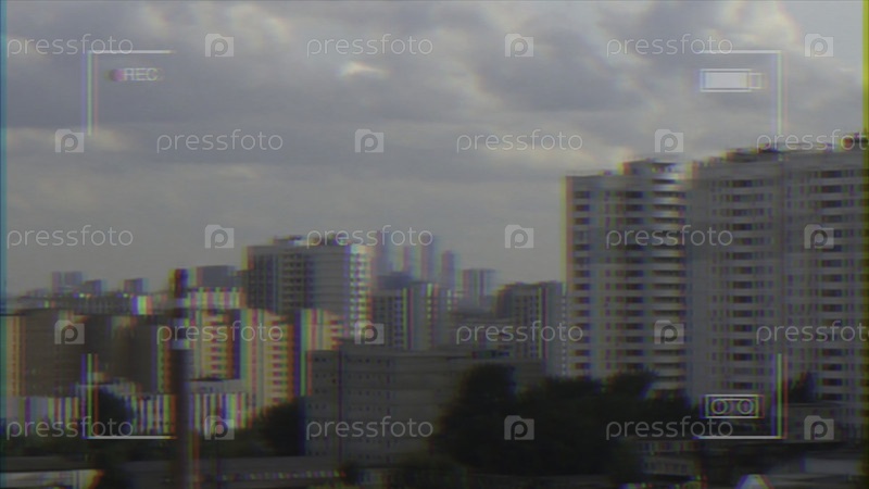 Вид через видеокамеру на жилых домах в спальной зоне на фоне серого облачного неба
