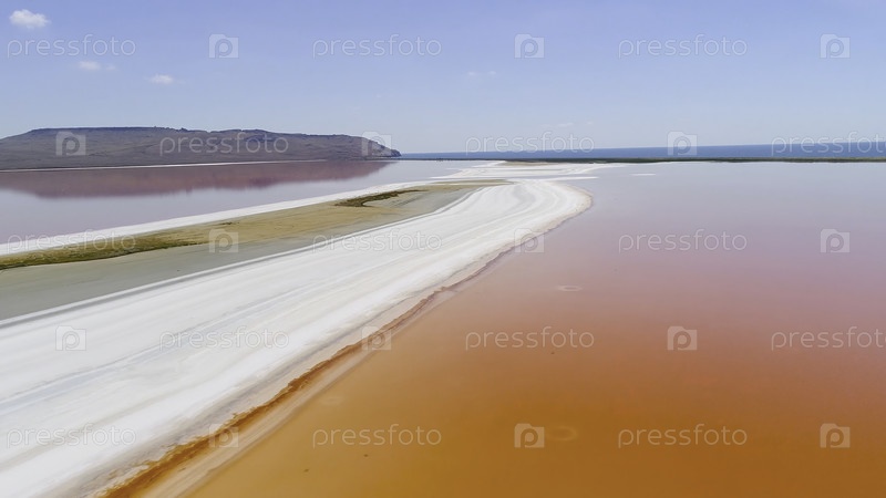 Оранжевое озеро в Крыму. Съемки. Вид на ярко-оранжевую воду озера на фоне белого песка. Инопланетный пейзаж красочной оранжевой воды на белом песке против голубого неба