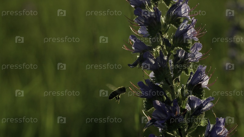 Закройте ос, летящую рядом с цветом на ярком фоне заката солнца.Креативно.Насекомые летают мимо полевой фабрики