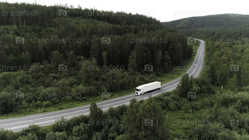 Вид с воздушного дрона на грузовик, едущий по изогнутой дороге среди зеленых деревьев.Сцена Белый длинный грузовик на пустой дороге возле лесного леса