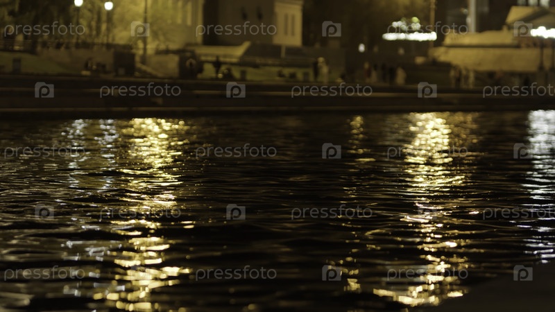 Покрыть поверхность воды огнями ночного города. резервные кадры. широкая бухта и темная городская улица в летнюю ночь с ходящими людьми