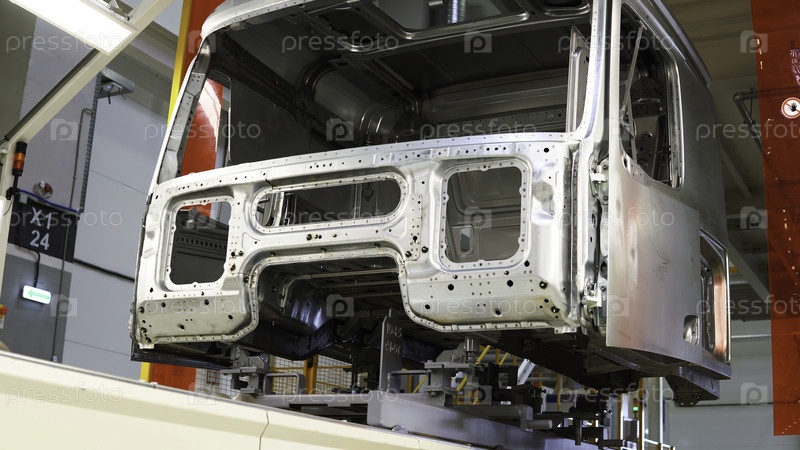 Кузов автомобиля в производственном процессе. Сцена. Производство автомобилей на крупном предприятии. Создание корпуса для автомобиля на машиностроительном предприятии