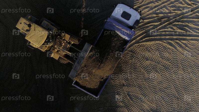Песчаная промышленность, песочная шахта в карьере.Сцена.Вид с воздуха бульдозерной машины, помещающей песок на заднюю часть грузовика
