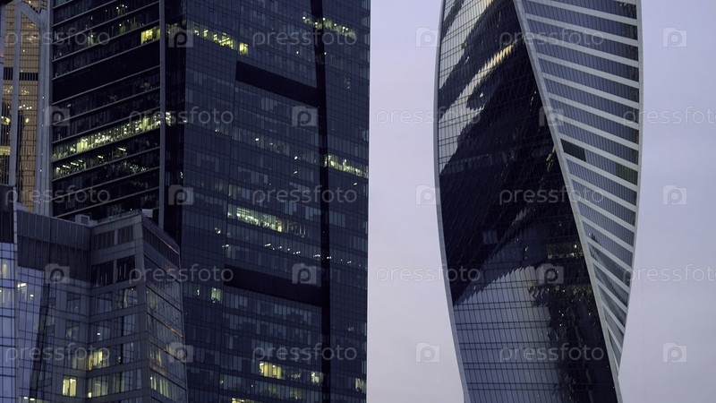 Небоскребы города Москвы на фоне серого неба.Пойдем дальше.Красивые небоскребы со скрученным стеклянным фасадом