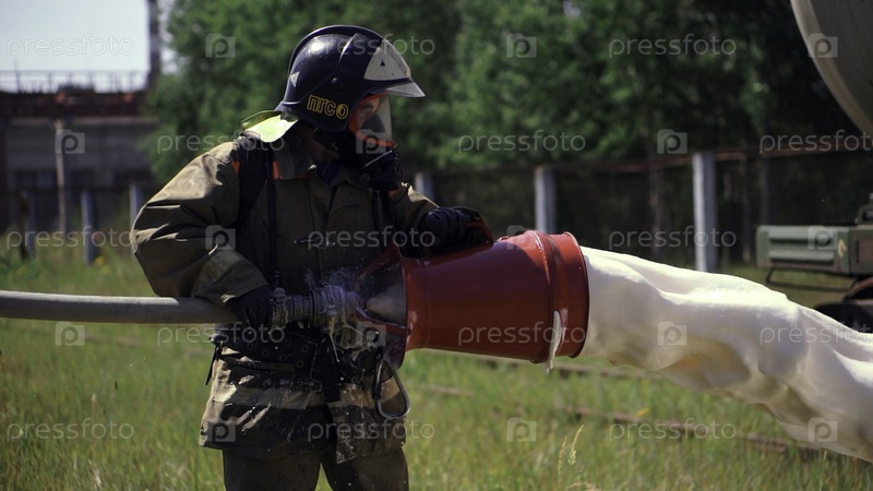 Рабочий процесс.Клип.Пожарные в униформе проверяют оборудование и наливают пену и воду