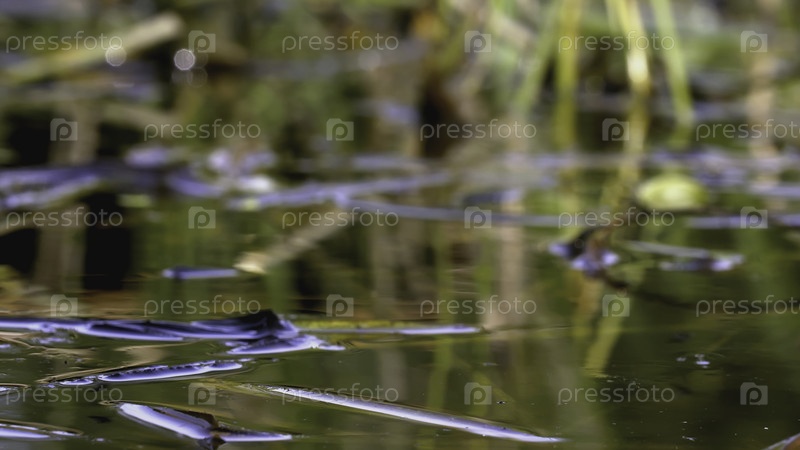 Красивый пруд рядом с зеленью и водно-болотными угодьями. творческий. тростники возле водоема весной. мухи летают вокруг пруда, а трава растет