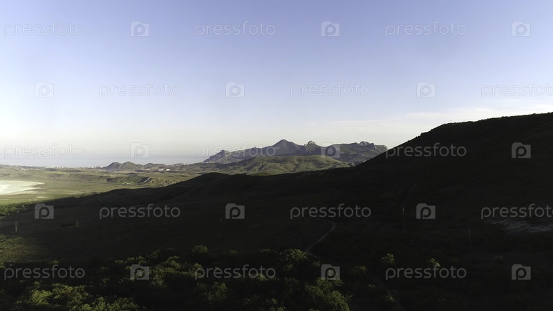 Вид с воздуха небольшого поселения в зеленых холмах с высокими горными хребтами и голубым морем на фоне синего неба