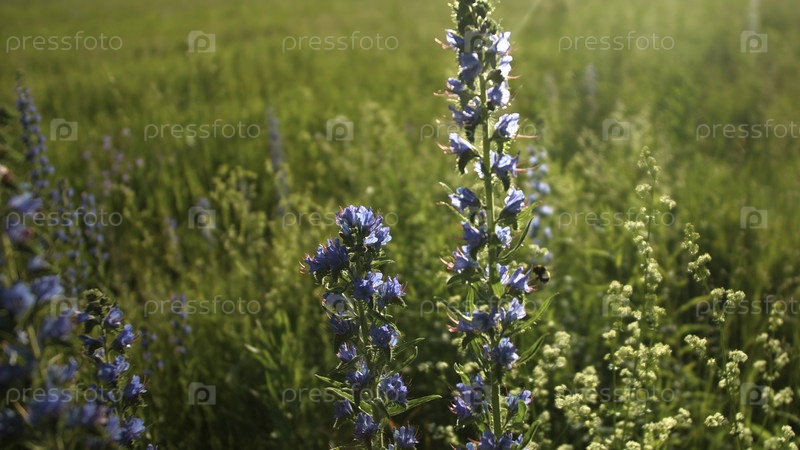 Пчела собирает пыльцу из голубых колоколов. Творчество. Красивая солнечная луга с цветущими цветами и насекомыми. Пчёлы летают синими колоколами в солнечный летний день. Макрокосм летнего луга
