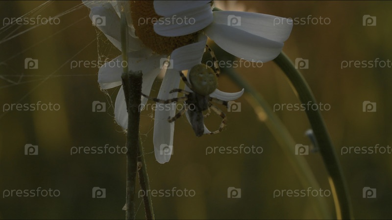 Закройте паука на ромашковом цвете, на летнем поле.Креативно.Паутина между цветками при закате солнца летом