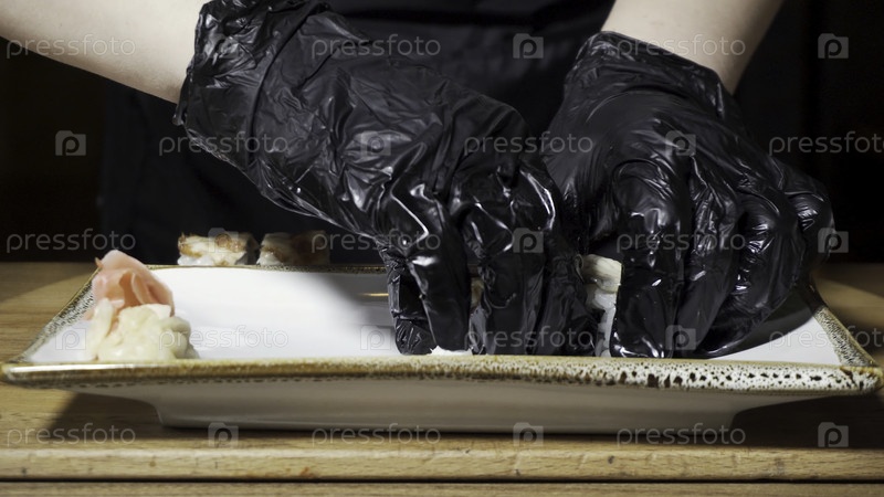 Руки шеф-повара кладут суши на тарелку с приготовленным васаби и имбирем, японская концепция ресторана. Рамка. Готовить в перчатках путем размещения вкусного суши на белой тарелке