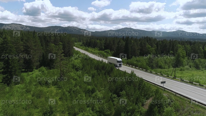 Вид грузовика, движущегося по шоссе в летний день. Сцена. Белый грузовик едет вдоль автомагистрали с зеленой лесистой местностью. Летом перевозятся автомобили и грузовики