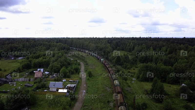 Железнодорожные пути с грузовыми поездами, движущимися за пределами города вблизи зеленых лесов