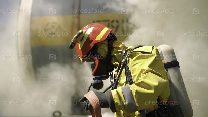 Мужчина-пожарный в шлемах и униформах с дымом на заднем плане.Пожарный готовит пожарный шланг, аварийная концепция