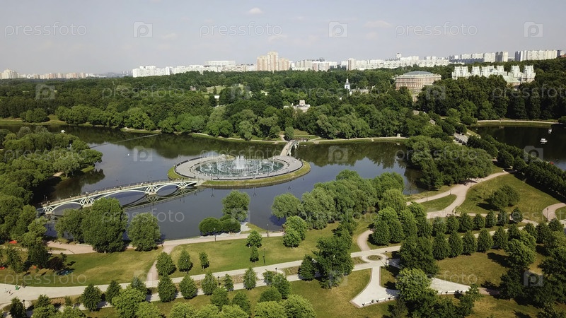 Вид с воздуха большого пруда, кустарников и деревьев в городском парке.Креативный летний день в парке на фоне голубого неба