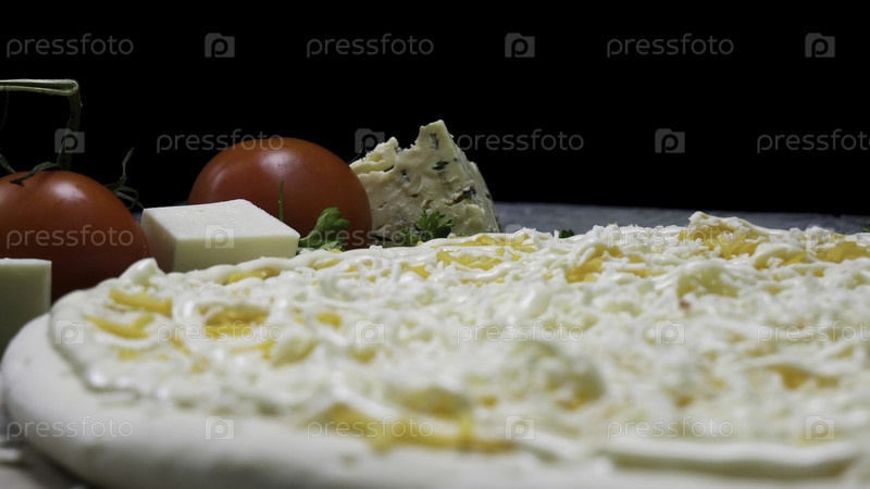 Свежая пицца с сыром и соусом майонеза и помидоры с кусками сыра, выделенными на черном фоне