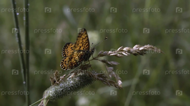 Близкий план красивой бабочки, отдыхающей на пышной зеленой траве в естественной обстановке