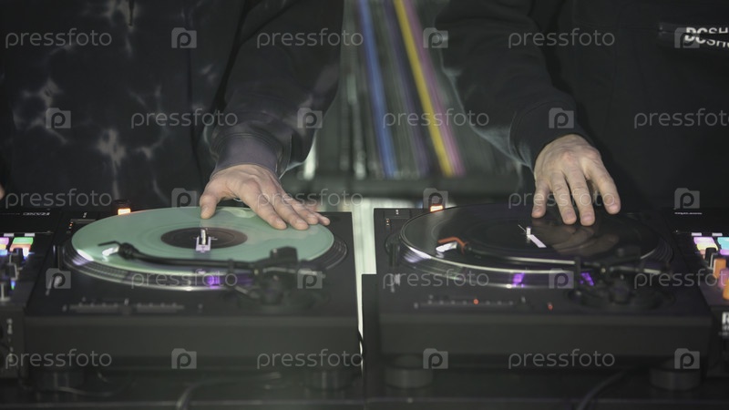 Диджеи играют в дискотеке. Искусство. Покрытие руки диджея на миксере. Яркая музыкальная панель на вечеринке. Работа музыкантов в ночном клубе