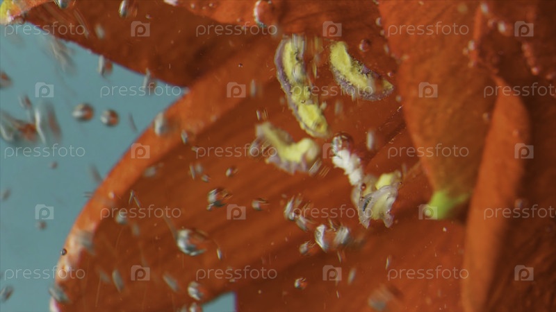 Покрыть желтые пестилы и штаммы пыльцой на фоне красных лепестков. резервные кадры. естественный цветочный фон