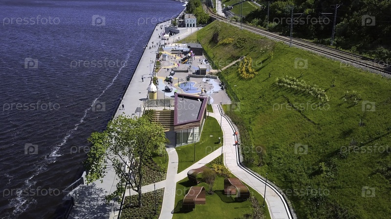 Вид на красивые парки рядом с берегом реки и парк для детей со горками и людьми, гуляющими по паркам