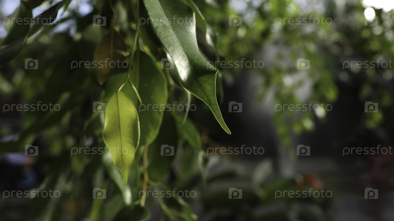 Зелёные сочные листья вытянуты, освещены солнечным светом на фоне другой зеленой растительности