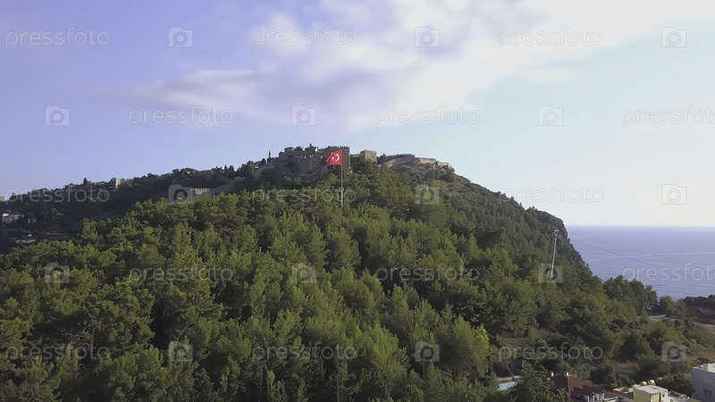 Анкара, Турция - 25 февраля 2022: Вид на город в Турции с холма днем. Клип. Красивое пригородное место в лесах с турецким флагом. Снято на квадрокоптере сверху