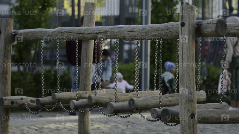 Большая игровая площадка. Резервные кадры. Деревянные решетки для детей, бегущие дети и их родители видны сзади. Высококачественная запись 4k