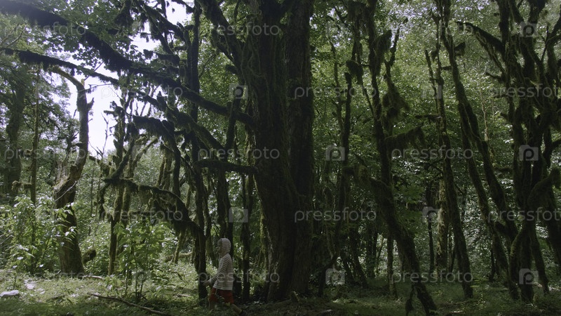 Ребенок гуляет по зелёным джунглям. Творческий. Мальчик ходит в густом зеленом лесу. Мальчик ходит один в диких зеленых зарослях леса летом
