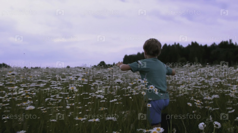 Мальчик бежит по лугу с цветами. творческий. задний вид ребенка, бегающего через поле ромашки. ребенок в синей одежде бегает на высокой траве с маргаритами