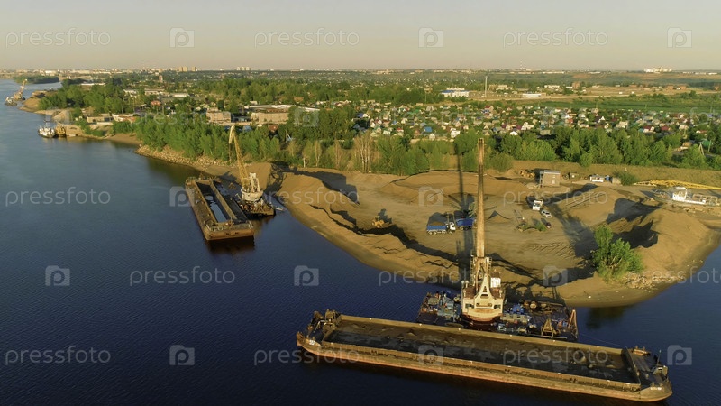 Вид с высоты птичьего полета. Сцена. Вы можете увидеть реку, на которой есть корабли для строительства с грузом на них и яркий город со зелёными летними деревьями на голубом небе