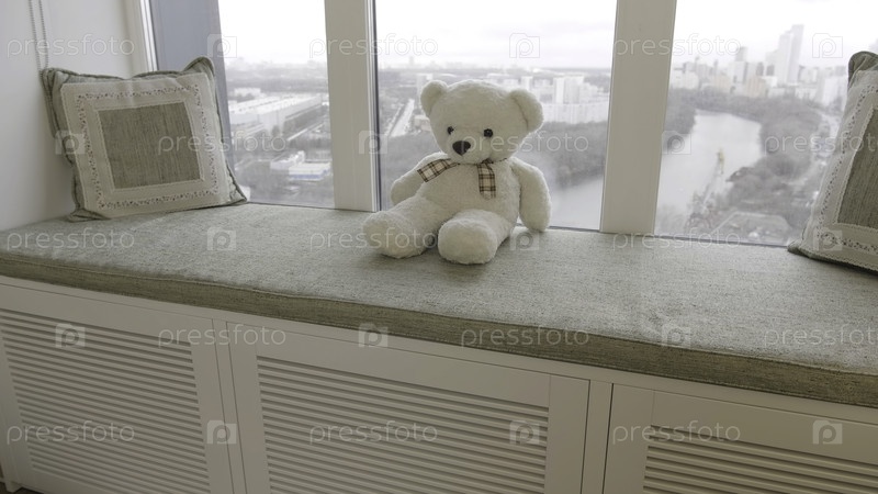 Тедди-медведь сидит на декоративном подоконнике.Креативно.Прекрасный белый игрушечный медведь у окна