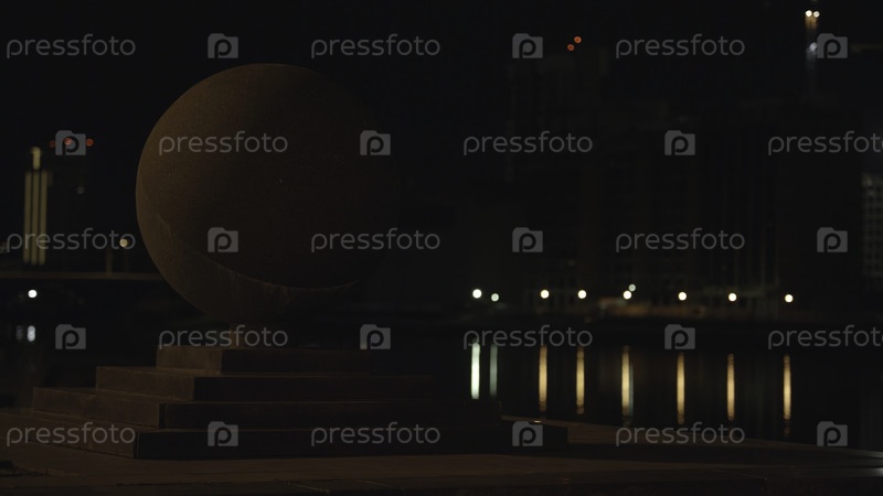Скульптура мяча в городе ночью.Сферальная каменная скульптура на набережной на фоне городских огней отражается в воде ночью.Геометрическая простая скульптура в городском ландшафте
