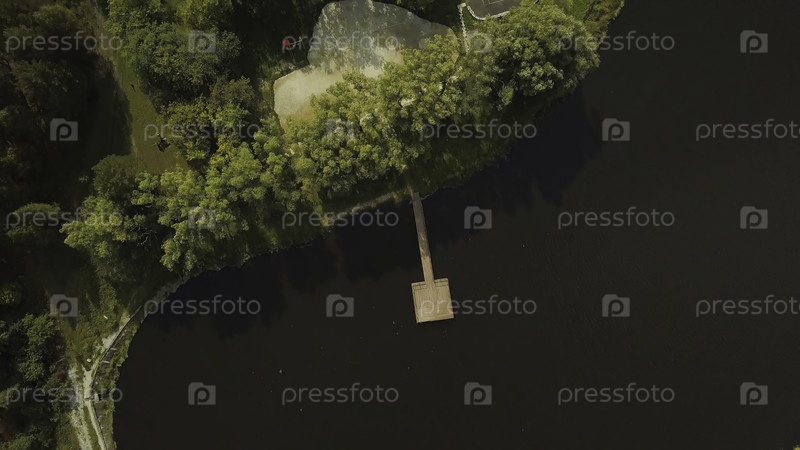 Вид сверху на озеро с деревянным пиром на фоне леса. Прекрасное загородное место для отдыха в зеленом лесу у озера. Загородной домик с озером и пристанью летом