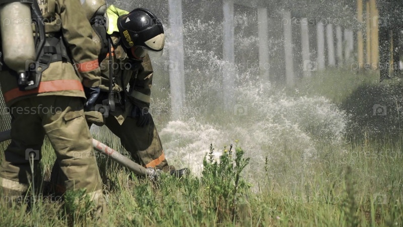 Пожарные.Клип.Два маскированных мужчины, которые занимаются с помощью шланга и воды со специальным оборудованием и в специальной форме.Высококачественный персонал FullHD