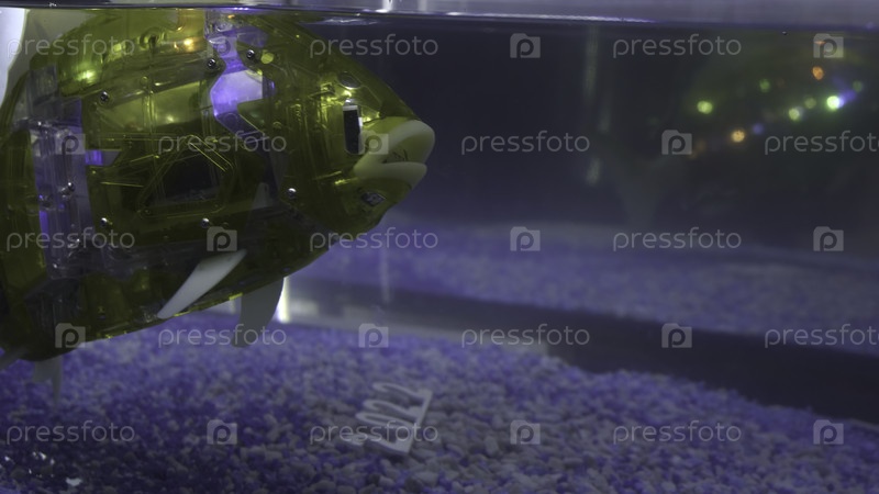 Рыба-робот в аквариуме. HDR. Светящаяся и мигающая рыбка в воде. Плавающая киберрыба в аквариуме. Создание новейших роботизированных моделей животных